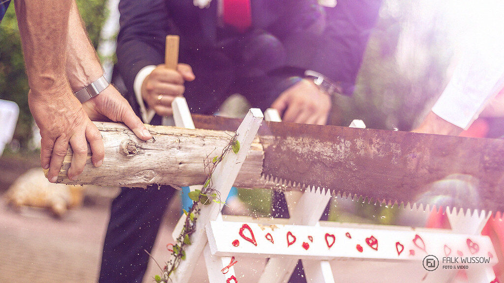 Das Brautpaar muss im gleichen Rhythmus zusammenarbeiten, um das Sägeblatt gleichmäßig zu bewegen und die Aufgabe erfolgreich zu meistern. Dieser Hochzeitsbrauch ist nicht nur eine spaßige Herausforderung, sondern steckt voller Symbolik – ein Moment, der für Gänsehaut sorgt!